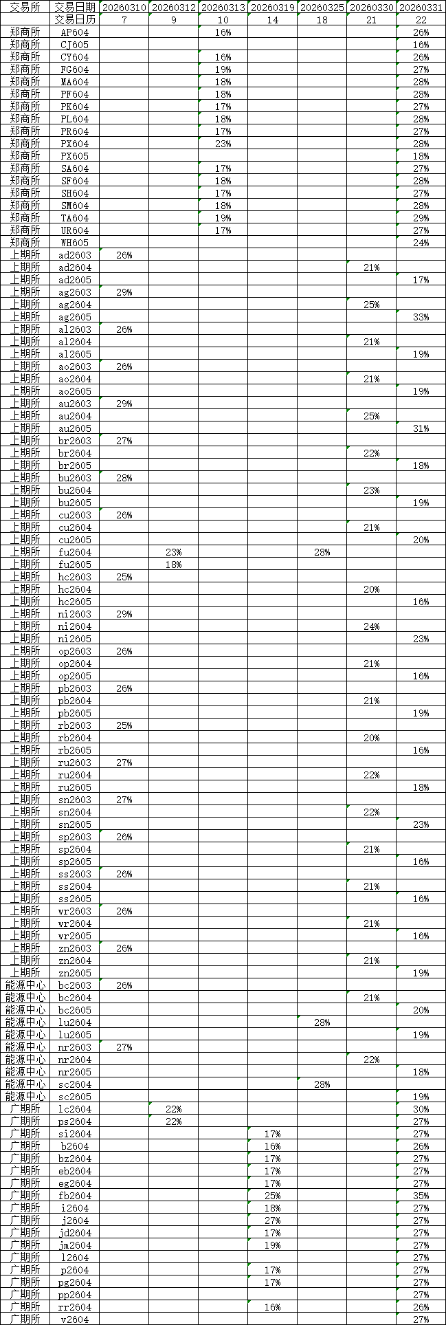 2026年3月近交割月保证金参数调整表